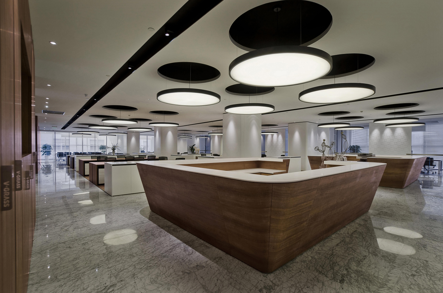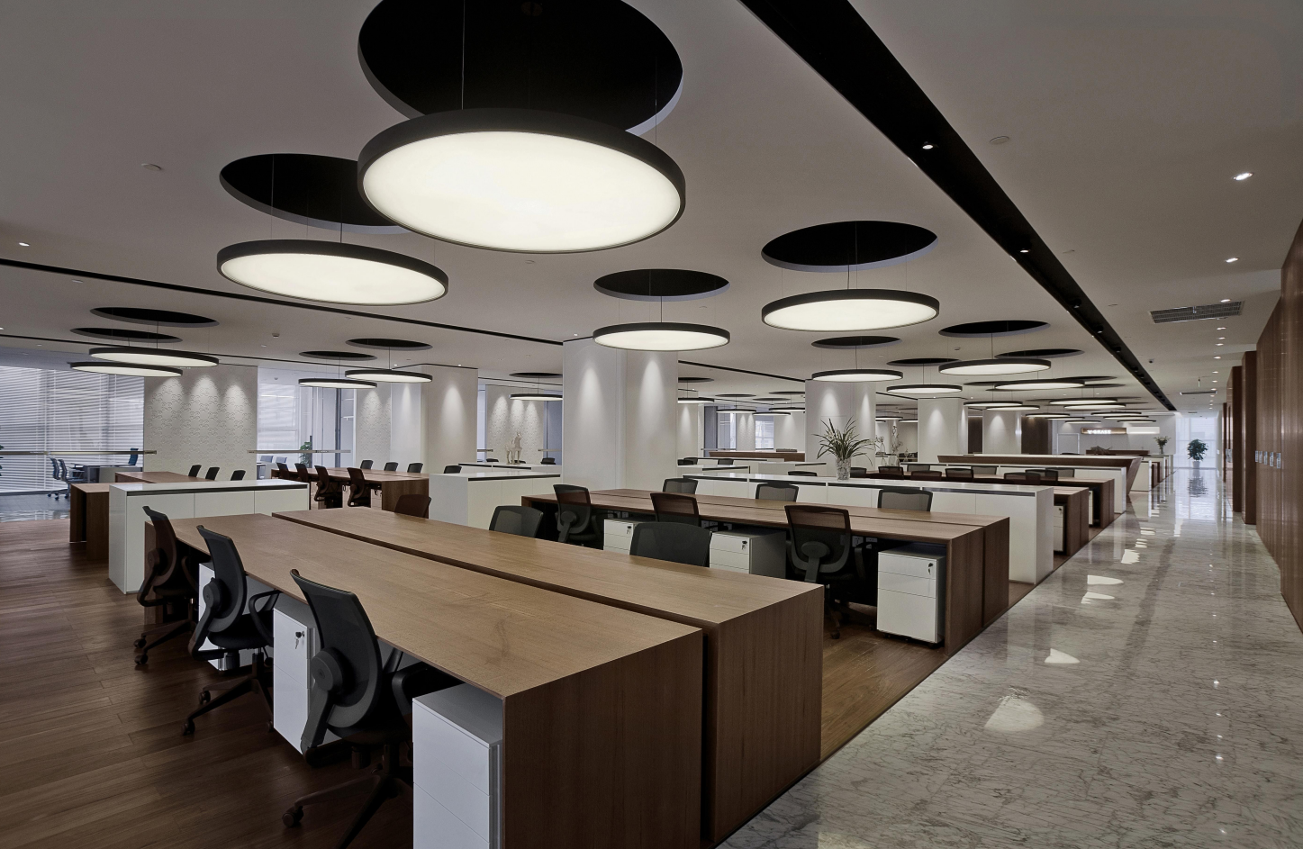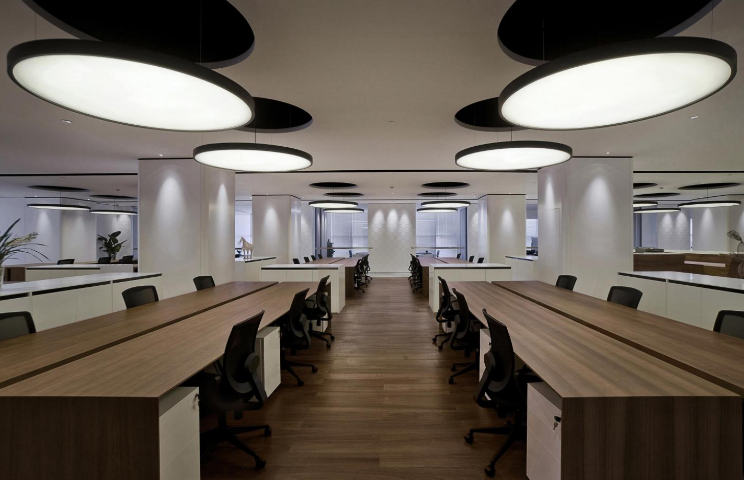 采用充足的自然光线和舒适的设施,在办公区面积大的地段使用通透的玻璃隔断